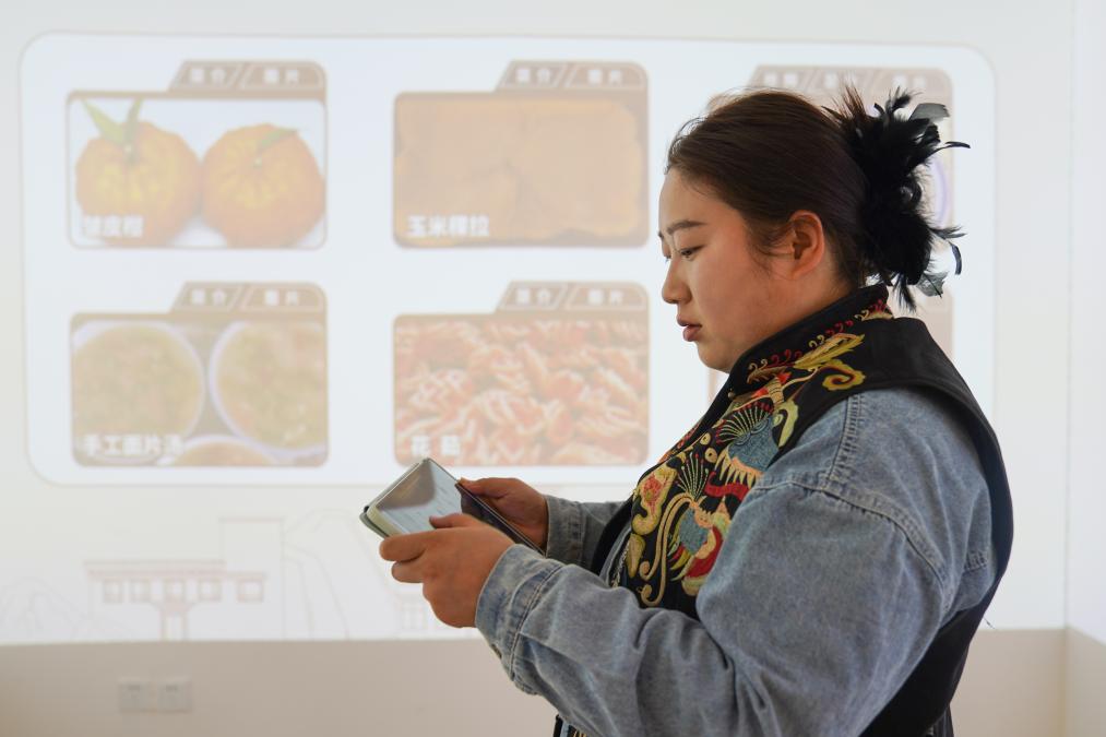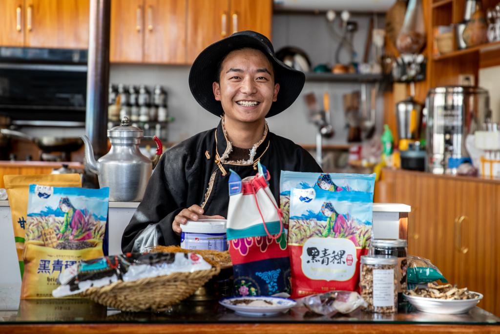 在四川省甘孜藏族自治州理塘縣甲洼鎮(zhèn),達洼在展示直播售賣的商品(11月3日攝)。