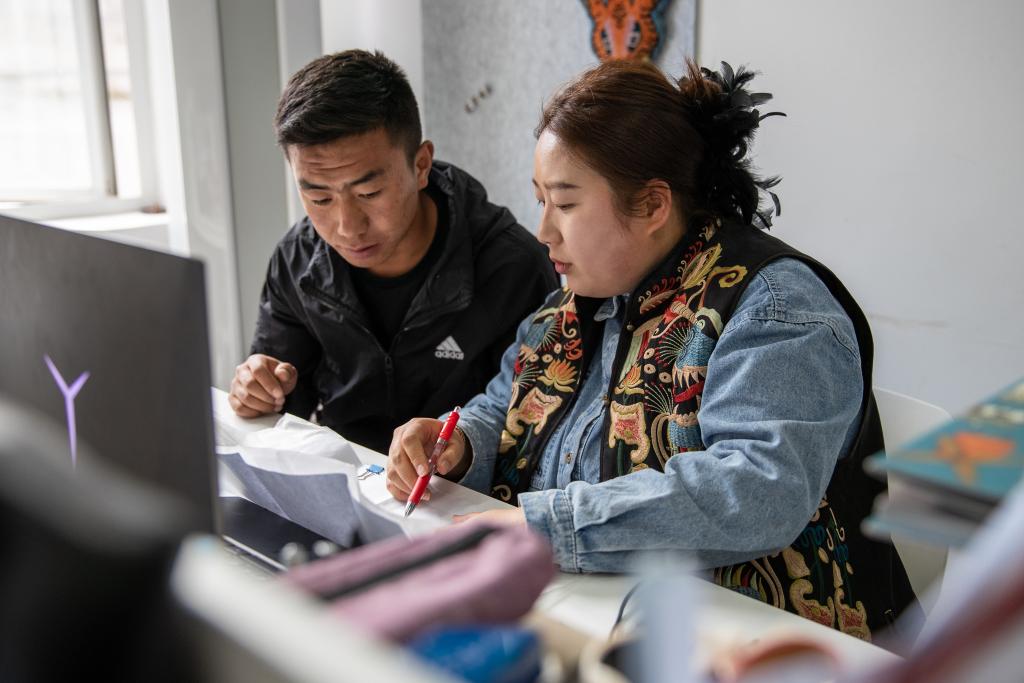 在四川省甘孜藏族自治州巴塘縣,劉莎莎在巴塘縣社會力量發(fā)展中心集群內的辦公室與同事討論工作(11月5日攝)。