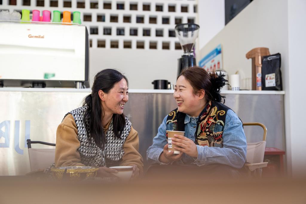 在四川省甘孜藏族自治州巴塘縣,劉莎莎在巴塘縣社會力量發(fā)展中心集群與咖啡廳的負責人格秋曲珍聊天(11月5日攝)。