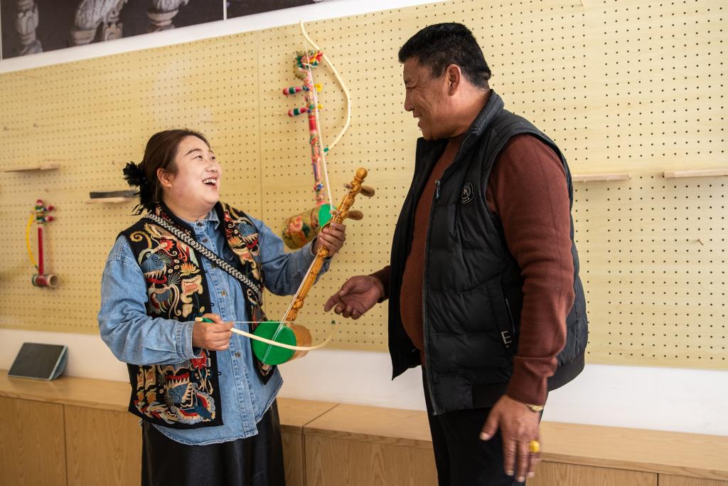 在四川省甘孜藏族自治州巴塘縣,南戈村黨支部書記益西澤仁在村史館教劉莎莎拉南戈弦胡(11月5日攝)。