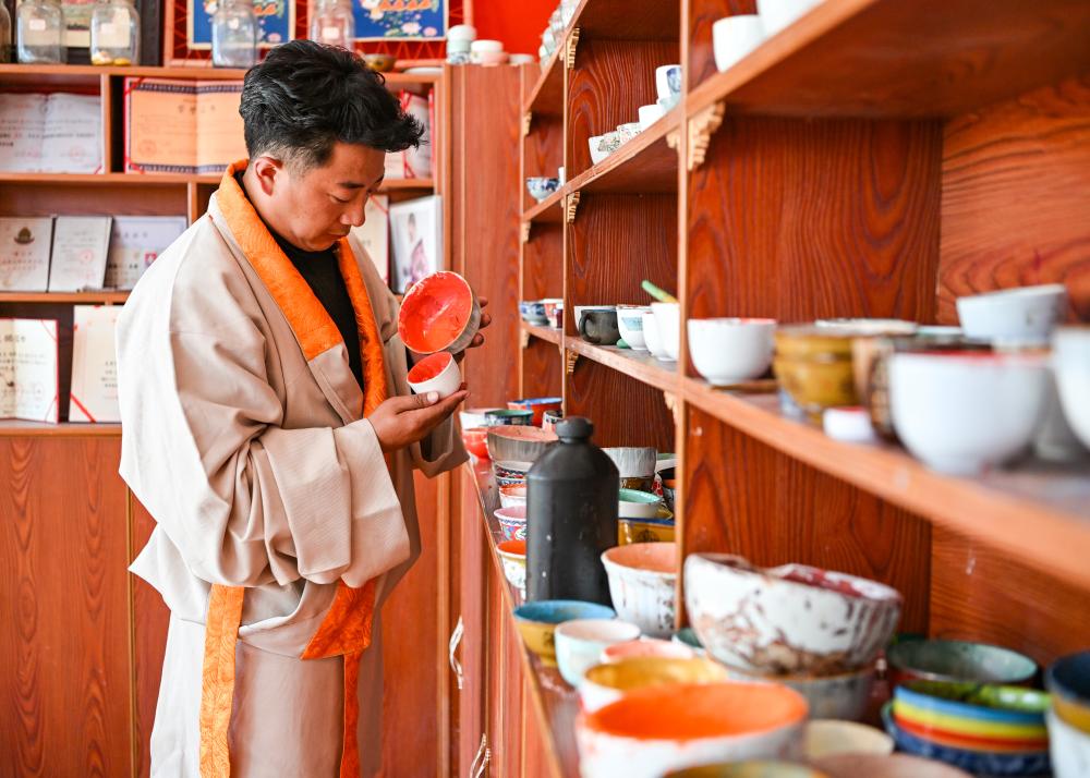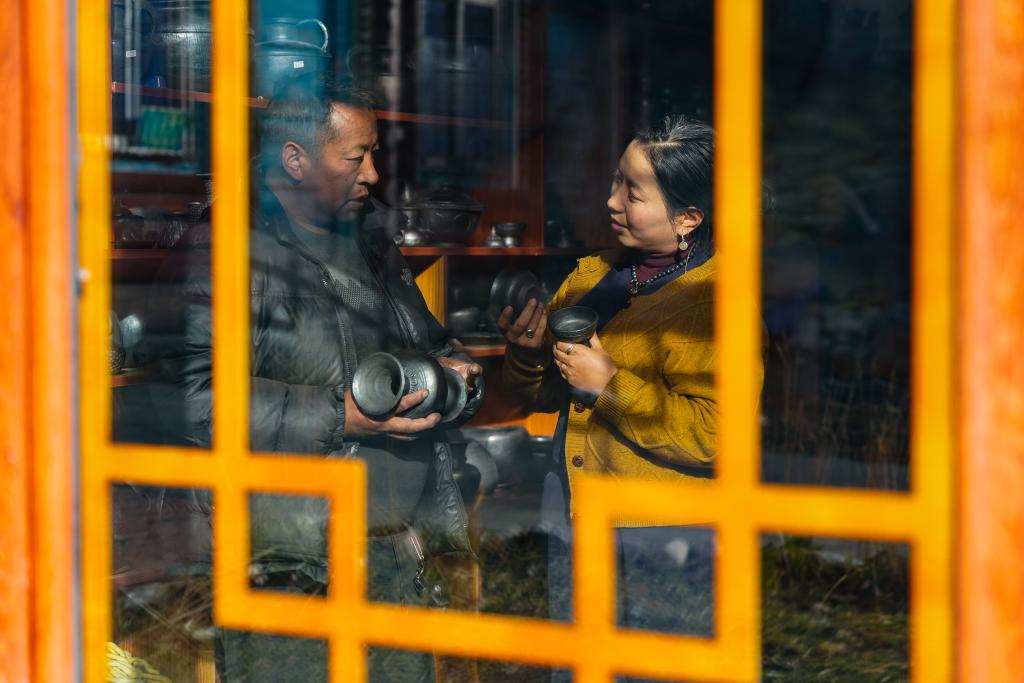 在德格縣麥宿鎮(zhèn)的扎堪倉黑陶工坊,達瓦卓瑪(右)向工坊主理人降擁格乃了解工坊近期的經營情況以及新品研制進展(11月4日攝)。達瓦卓瑪經常會與麥宿鎮(zhèn)的其他手工藝者交流經營中遇到的問題,想辦法幫他們解決。