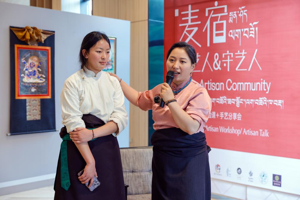在四川省成都市寬窄巷子附近的皋月畫廊舉辦的“麥宿集市”上,達瓦卓瑪(右)向觀眾介紹麥宿年輕的手工藝者(2024年5月17日攝)。