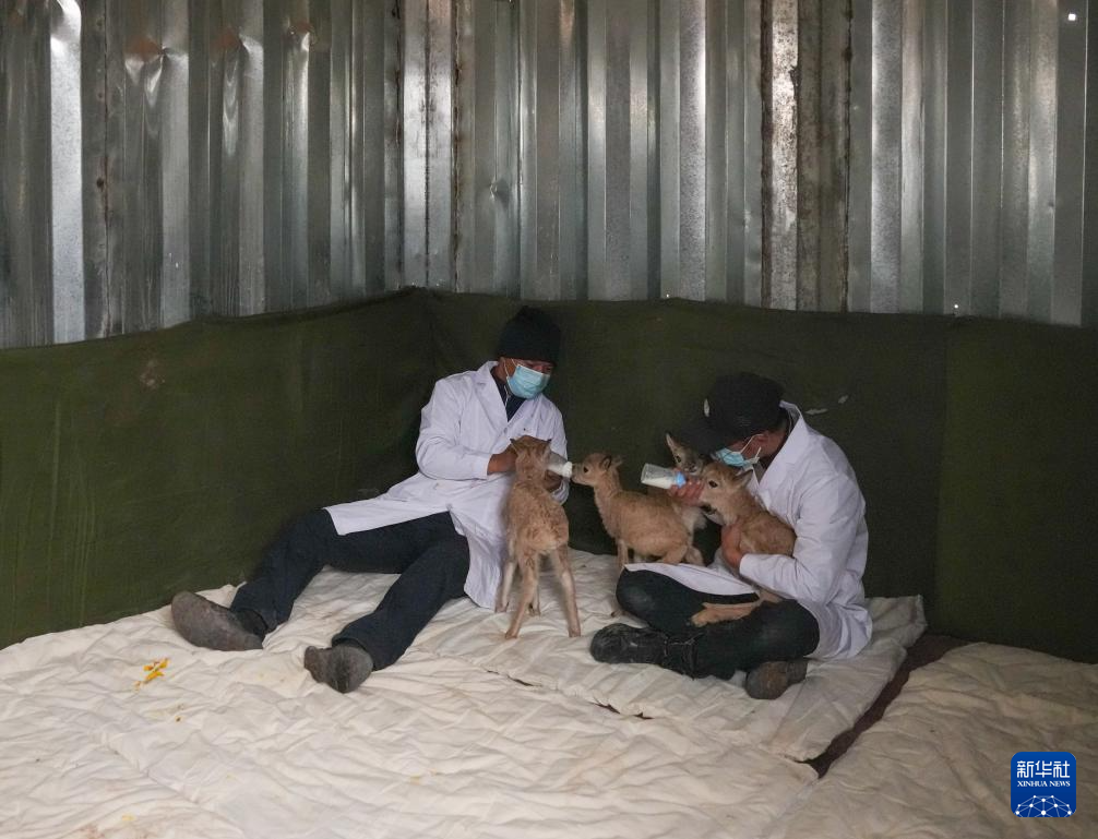 巡山隊(duì)員在可可西里卓乃湖保護(hù)站給救助的小藏羚羊喂奶(7月2日攝)。新華社記者 杜笑微 攝