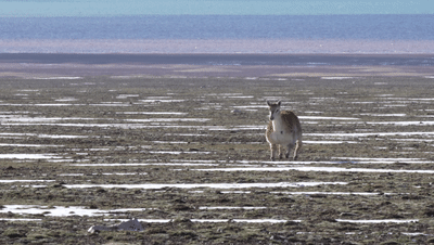 正在埋頭吃草的藏羚羊顯然對(duì)這只新來的“伙伴”充滿了好奇,紛紛停止覓食,抬起頭來,打量著這個(gè)有點(diǎn)不一樣的“新人”。很明顯,機(jī)警膽小的藏羚羊只是有點(diǎn)好奇,“新人”的“妝感”并沒有把它們嚇跑。終于,這只有點(diǎn)特殊的“藏羚羊”成功入群,成為卓乃湖畔成千上萬只藏羚羊中的一員。