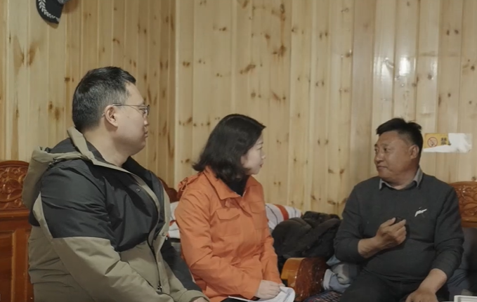 記者在可可西里采訪秋培扎西(右一)。 新華社記者 鄧寒思 攝