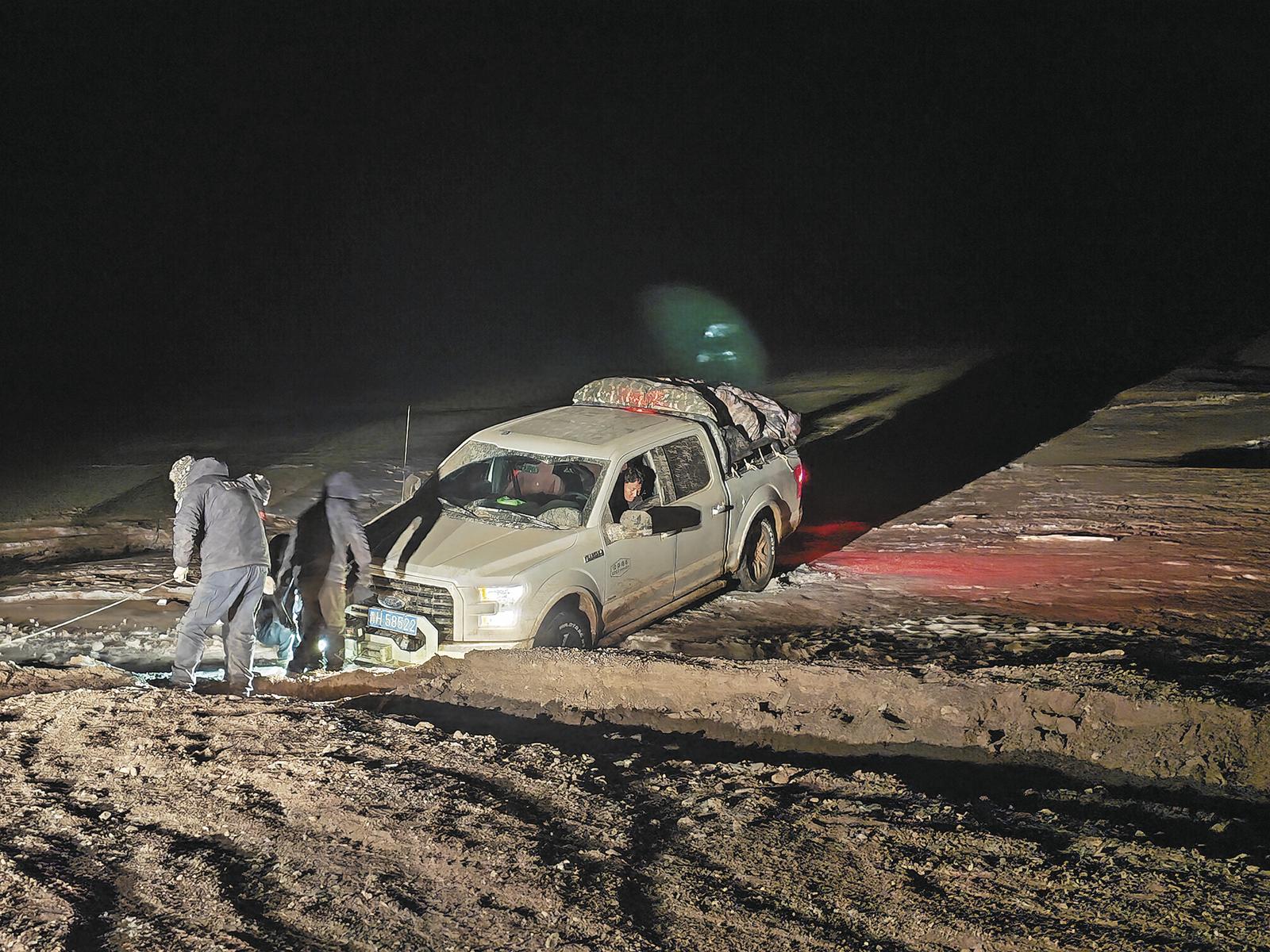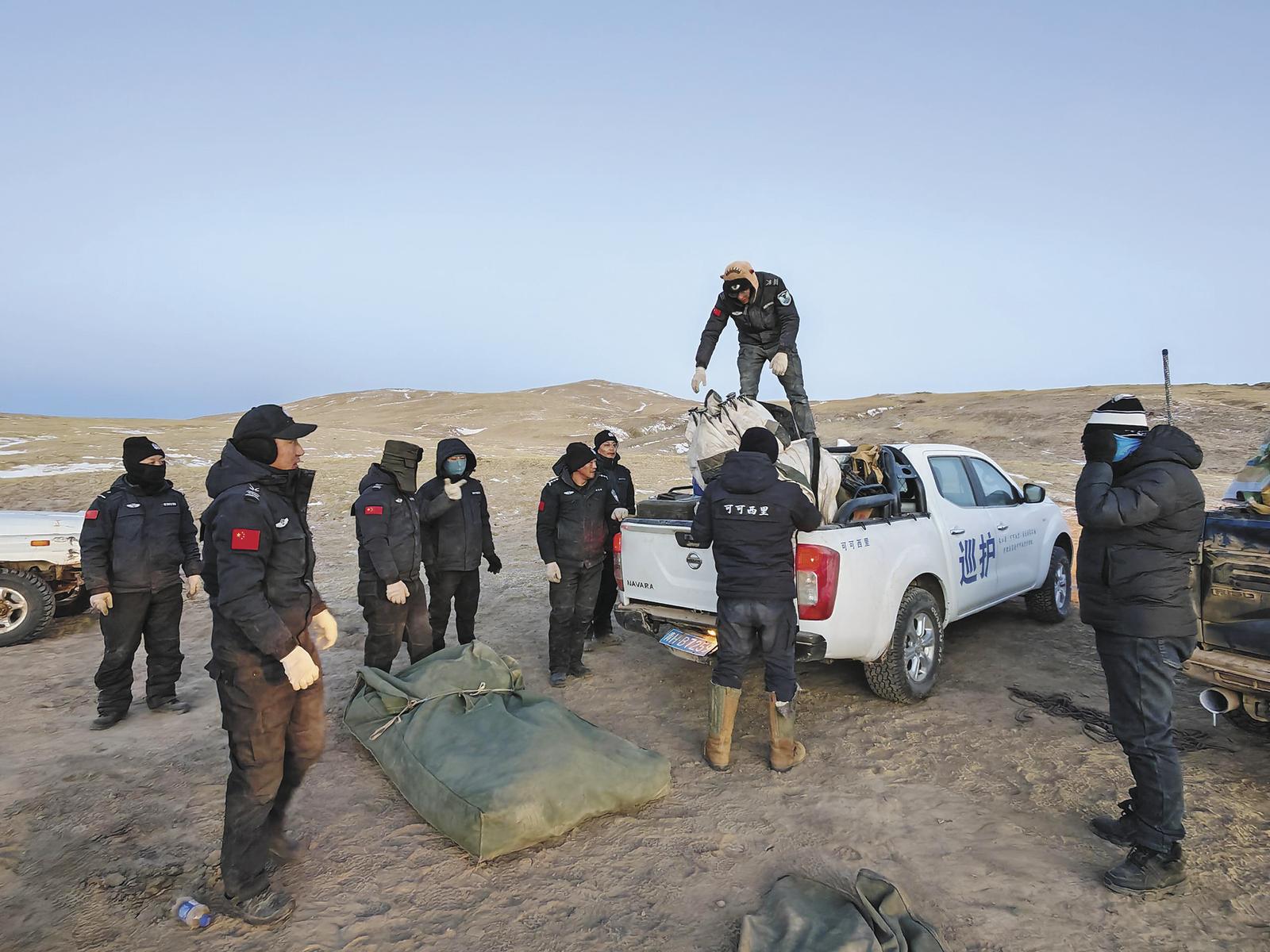 “此行主要為打擊N35非法穿越,我們沿著非法穿越者常走的路線,路上也遇到了很多困難?!彪S隊記者口述,為了盡早趕到庫南保護(hù)站,8日20時一行人從太陽湖出發(fā),車輛卻不斷陷入冰河,還遭遇了爆胎。9日早晨6時,大家才在車?yán)镄菹⒘藘蓚€小時,之后接著趕路。在斷斷續(xù)續(xù)的信號中,隨隊記者陸續(xù)發(fā)回現(xiàn)場照片和視頻。