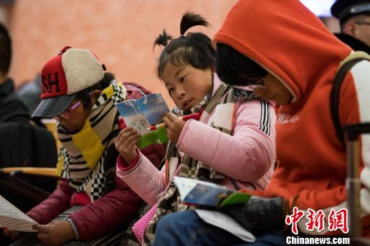 在候車室內(nèi),小姑娘正閱讀拉薩火車站發(fā)放的安全防護(hù)知識(shí)。 何蓬磊 攝