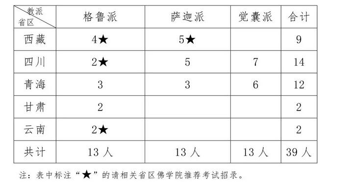 根據(jù)國家宗教事務(wù)局《藏傳佛教學(xué)銜授予辦法(試行)》,2018年我院計(jì)劃招收第十七屆高級學(xué)銜班39人,其中格魯派13人,薩迦派13人和覺囊派13人,學(xué)制三年。計(jì)劃在西藏招收9人,四川招收14人,青海招收12人,甘肅招收2人,云南招收2人。