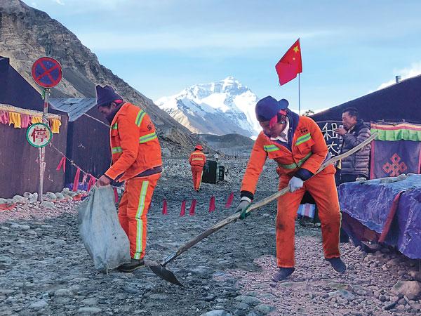 珠穆朗瑪峰巍然聳立在世界屋脊,是我國乃至全世界生態(tài)環(huán)境的“晴雨表”。近年來,黨中央、國務(wù)院高度重視西藏生態(tài)環(huán)境保護(hù),在國家有關(guān)部委大力支持下和自治區(qū)相關(guān)部門共同努力下,珠峰地區(qū)一直實施嚴(yán)格的環(huán)保措施,形成了多元參與的珠峰生態(tài)環(huán)境保護(hù)格局。在嚴(yán)格的生態(tài)環(huán)保政策作用下,珠穆朗瑪峰我國西藏一側(cè)的生態(tài)環(huán)境持續(xù)向好。圖為近日,海拔5200米的珠峰大本營內(nèi),環(huán)衛(wèi)工人在清理垃圾。記者 陳林 攝