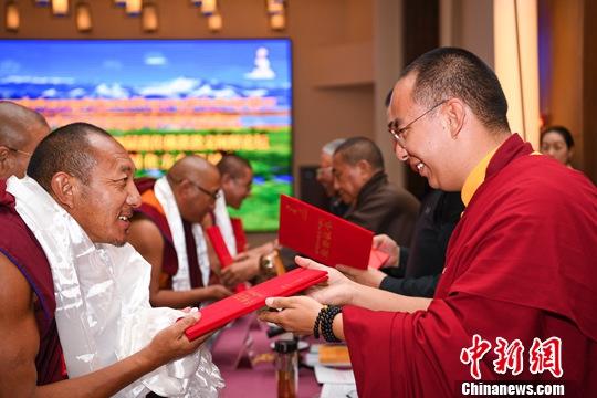 9月10日,中國(guó)佛教協(xié)會(huì)西藏分會(huì)第四屆藏傳佛教教義闡釋論壇暨堅(jiān)持藏傳佛教中國(guó)化方向研討會(huì)在日喀則市舉行。圖為全國(guó)政協(xié)常委、中國(guó)佛協(xié)副會(huì)長(zhǎng)、中國(guó)佛協(xié)西藏分會(huì)會(huì)長(zhǎng)班禪額爾德尼·確吉杰布(右)為優(yōu)秀闡釋論文作者頒獎(jiǎng)。中新社記者 何蓬磊 攝