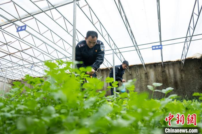 普瑪江塘邊境派出所民警在溫室大棚里為蔬菜澆水。何蓬磊 攝