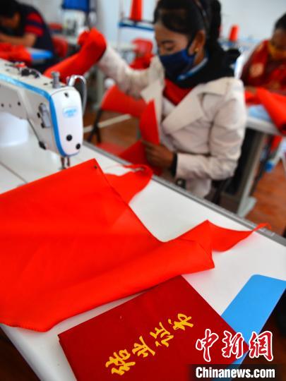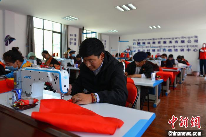 西藏山南森布日極高海拔地區(qū)生態(tài)搬遷安置點的牧民正縫制紅領(lǐng)巾。江飛波 攝