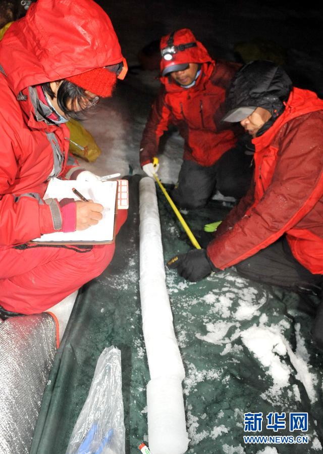 2017年7月1日,第二次青藏高原綜合科考冰川與環(huán)境變化考察隊前往龍匣宰隴巴冰川末端鉆取冰芯。這是科考隊員丈量、標記、裝封冰芯。新華社發(fā)(索朗羅布 攝)