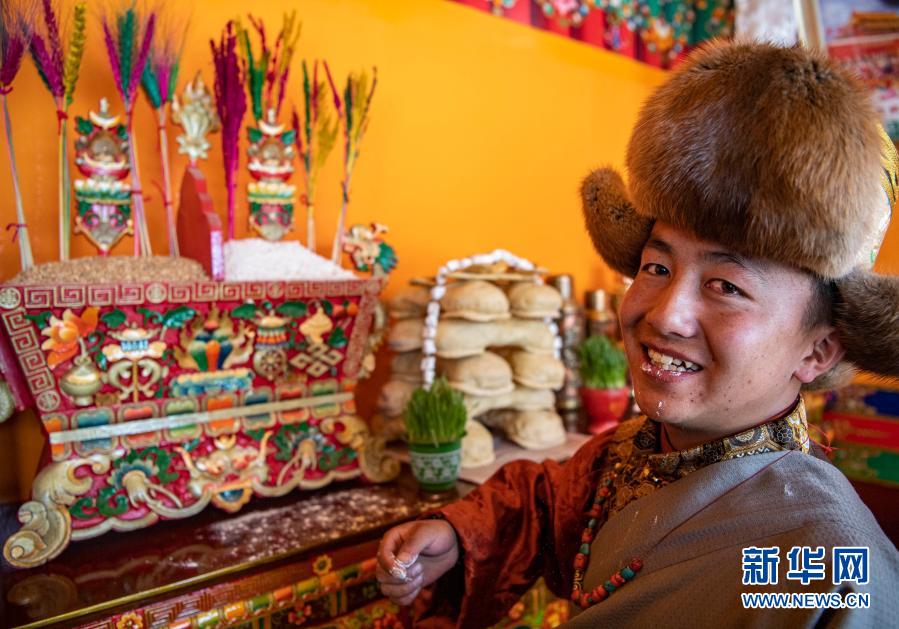 1月14日,在位于嘎吉林村安置點(diǎn)的新家中,村民羅追按習(xí)俗吃“切瑪”,祈福新年吉祥。新華社記者 孫非 攝