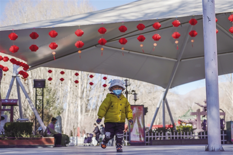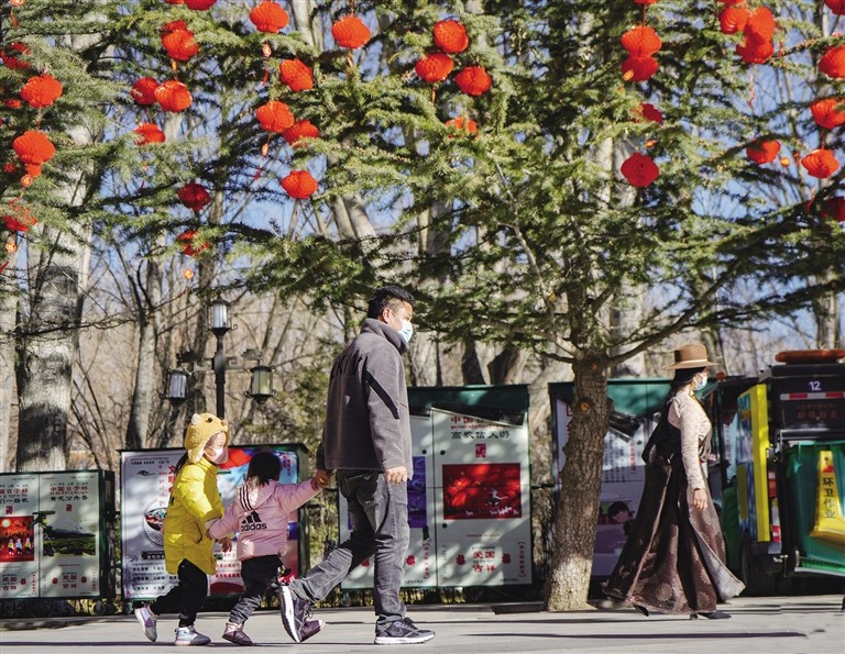結(jié)束晨練的邊珍正在給紅燈籠下一蹦一跳玩耍的孫女拍照,“到處都掛滿(mǎn)了紅燈籠,把公園裝扮得格外喜慶,很有節(jié)日的氣息?!边呎湔f(shuō)。