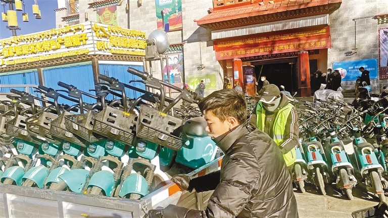 “?!瓪g迎使用共享電動(dòng)車(chē),請(qǐng)?jiān)谶\(yùn)營(yíng)區(qū)內(nèi)騎行,請(qǐng)慢點(diǎn),注意安全。”共享電動(dòng)車(chē)在拉薩市的落地投放,有利于緩解市民停車(chē)難、出行難壓力,助力城市智慧交通建設(shè)。在拉薩萬(wàn)達(dá)廣場(chǎng)門(mén)口,工作人員正將共享電動(dòng)車(chē)擺放整齊,并用酒精擦拭消毒。