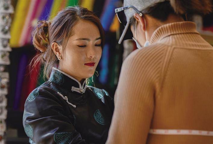 近年來,傳統(tǒng)的藏裝店也開始“觸網(wǎng)”,與時俱進地逐漸走上了線上銷售渠道。店鋪將自家的新款藏裝錄制成短視頻發(fā)布在短視頻平臺上,這樣一來,吸引了不少顧客前往實體店鋪定制購買藏裝。666時尚藏裝店的店長格桑措姆介紹道,她會時常穿上自家的藏裝在短視頻平臺上進行推廣銷售,收到了不少點贊與關注。