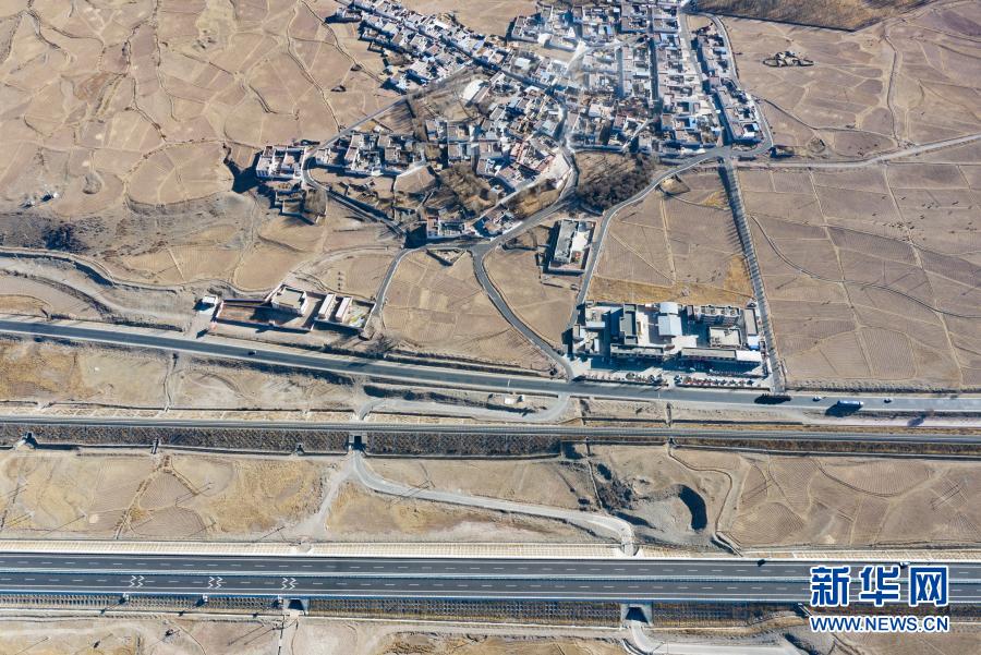 這是拉薩至那曲高等級公路(下)和青藏鐵路沿線村莊(1月28日攝,無人機(jī)照片)。新華社記者 孫非 攝