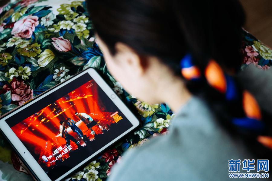 2月10日,在西藏自治區(qū)山南市乃東區(qū),格央在自己房間里使用平板電腦觀看《說唱新世代》視頻片段。新華社記者 劉金海 攝