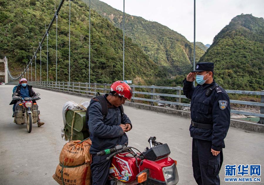 在三代解放大橋上,西藏林芝邊境管理支隊(duì)墨脫大隊(duì)背崩邊境派出所的民警在檢查過往車輛和人員(2月10日攝)。新華社記者 孫非 攝