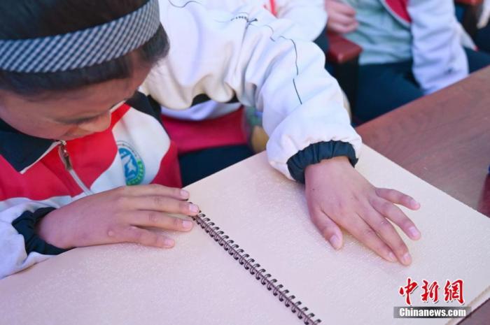 圖為3月11日,拉薩市特殊教育學校的學生讀盲文法律宣傳手冊。中新社記者 趙朗 攝