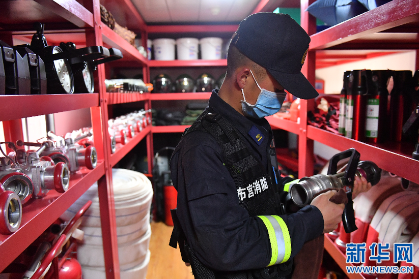 布達拉宮消防救援大隊隊員在巡邏期間檢查消防設施(3月4日攝)。新華社記者 孫瑞博 攝