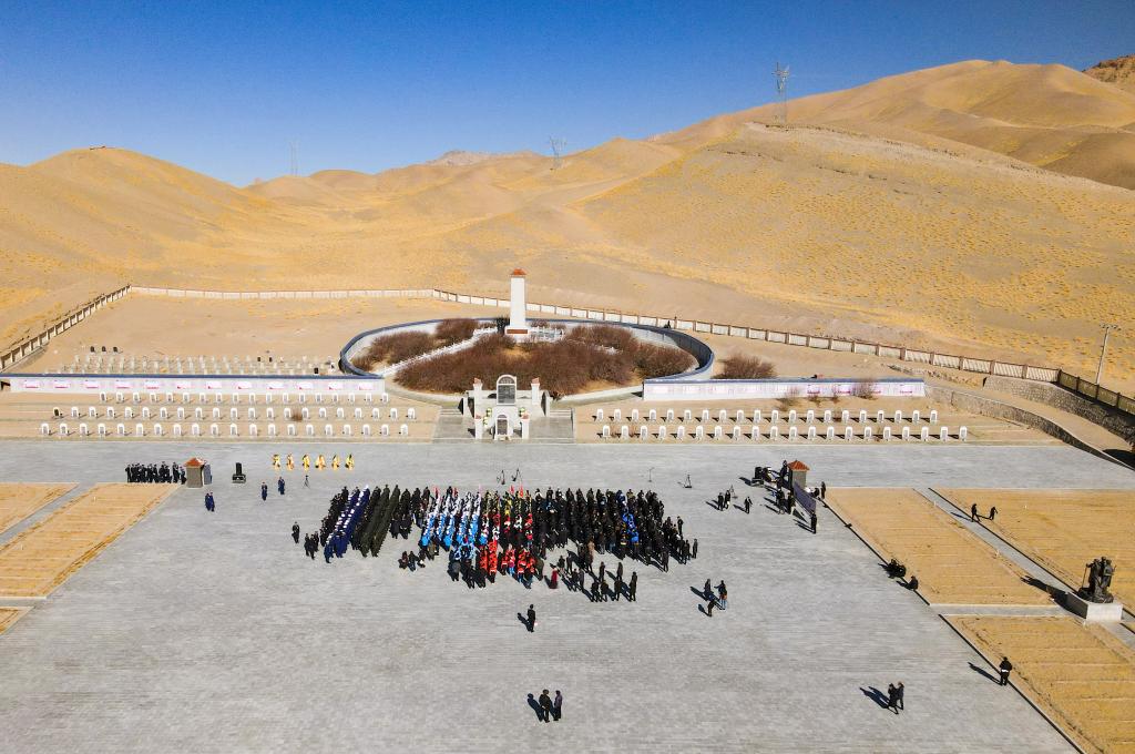 阿里的黨員干部、解放軍、學(xué)生及群眾,聚集在獅泉河烈士陵園里緬懷先烈。(2021年4月4日 新華社記者張兆基 攝 無人機照片)
