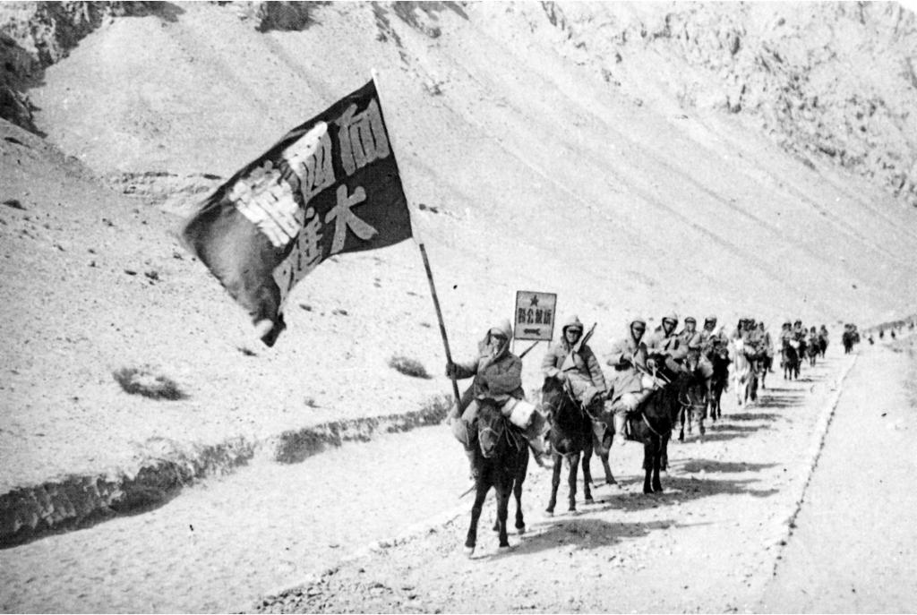 進藏先遣連高舉紅旗向西藏阿里進軍(執(zhí)旗者為先遣連副連長彭青云)。進藏先遣連紀(jì)念館提供