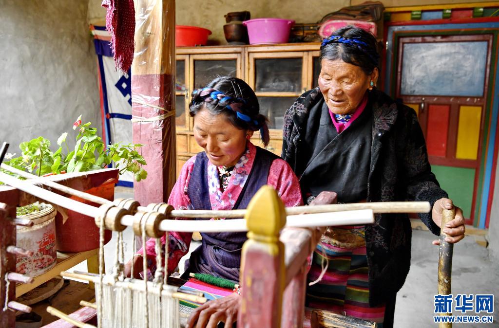 拉巴(右)指導女兒尼瑪倉木決織氆氌(3月20日攝)。新華社記者 張汝鋒 攝
