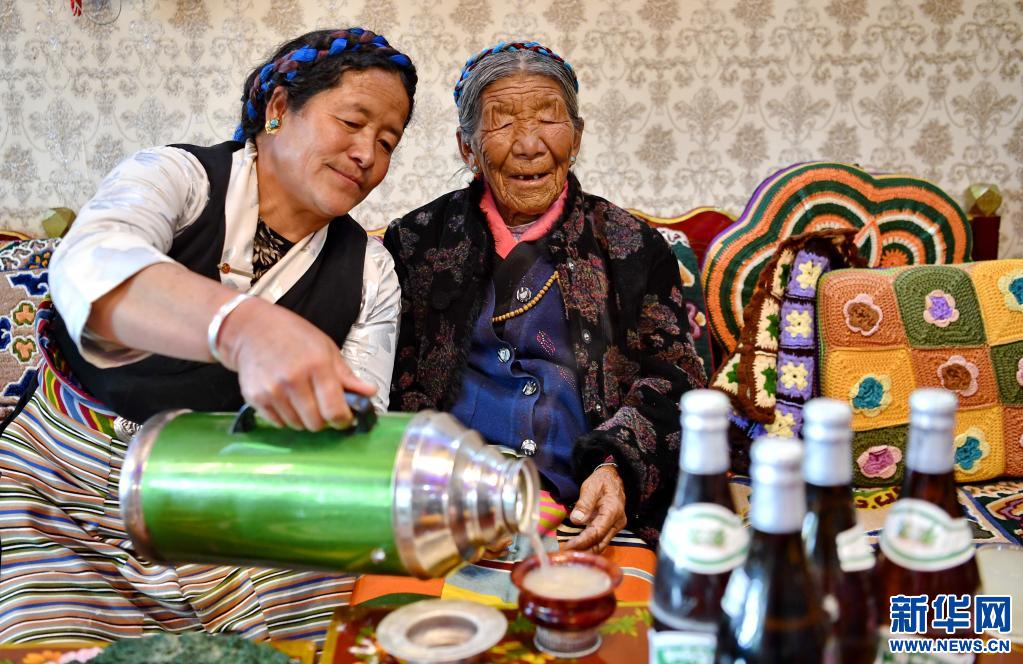 邊巴倉(cāng)決的鄰居在給老人倒茶(3月19日攝)。新華社記者 張汝鋒 攝