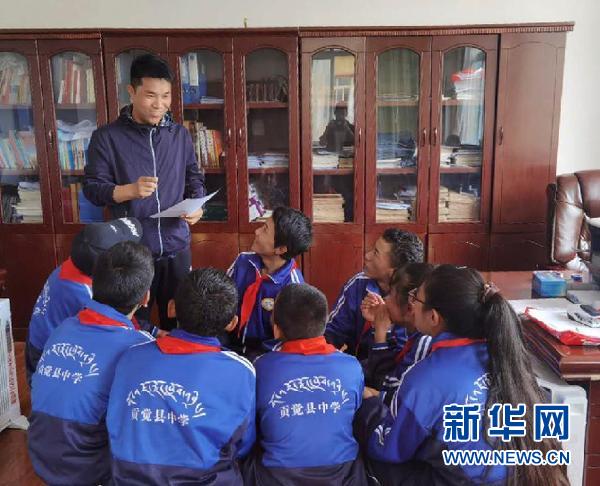 陳洪順給西藏自治區(qū)昌都市貢覺(jué)縣中學(xué)的學(xué)生上課(2020年4月30日攝)。新華社發(fā)