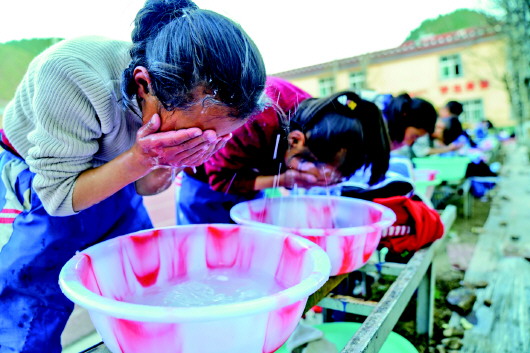 4月30日,在類烏齊縣桑多鎮(zhèn)第二小學,學生們用熱水洗漱。這套熱水設(shè)施由李純民發(fā)起的“齊興”助學獎勵基金捐助。 記者劉金海、黃臻攝