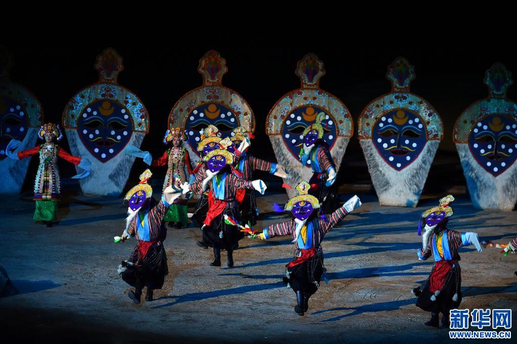 大型實景劇《文成公主》演職人員共計800余名,除專職演員外,很多當?shù)夭刈遛r(nóng)牧民參與演出,有效促進了當?shù)厝罕娋蜆I(yè)增收。圖為演員在劇中表演藏戲(2019年10月31日攝)。新華社記者 李鑫 攝