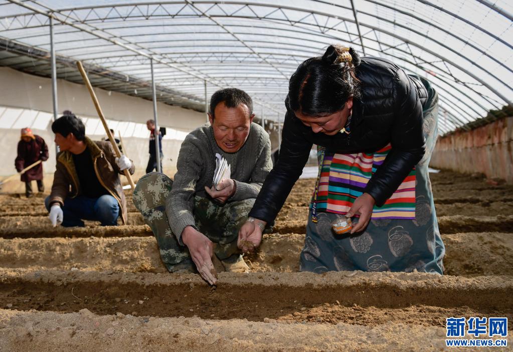 2018年3月13日,西藏阿里地區(qū)噶爾縣生態(tài)農(nóng)業(yè)產(chǎn)業(yè)園農(nóng)技人員楊茂錄(右二)在園區(qū)大棚中為當?shù)刎毨羰_桑嘎(右)傳授瓜果種植技術。新華社記者 劉東君 攝