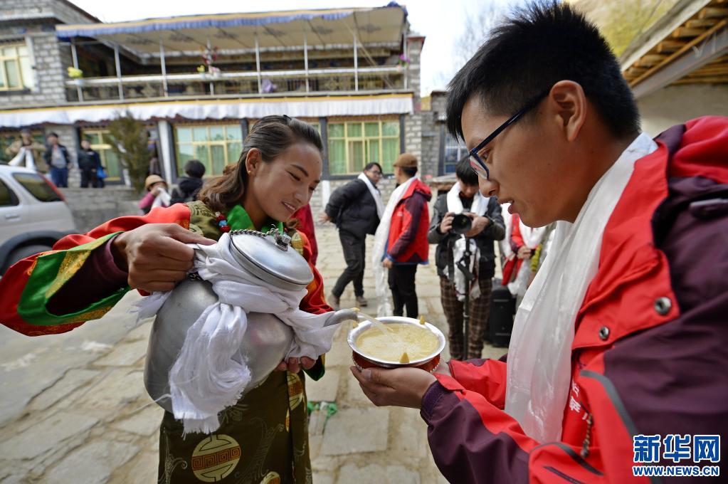 2016年11月15日,在拉薩市城關區(qū)奪底鄉(xiāng)維巴村,身著盛裝的藏族姑娘德吉為剛抵達她家的游客斟滿青稞酒。德吉是特色民宿“洛奔曲闊拉薩人家”的主人。新華社記者 劉東君 攝