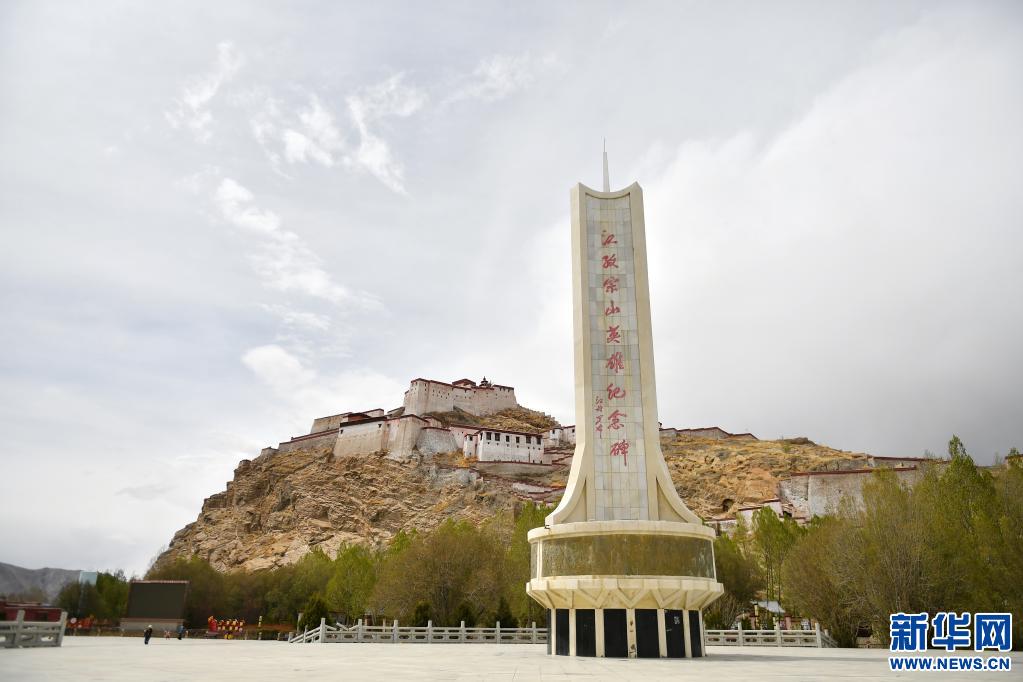 這是3月23日在江孜宗山古堡拍攝的跳崖英雄紀(jì)念碑。新華社記者 孫瑞博 攝