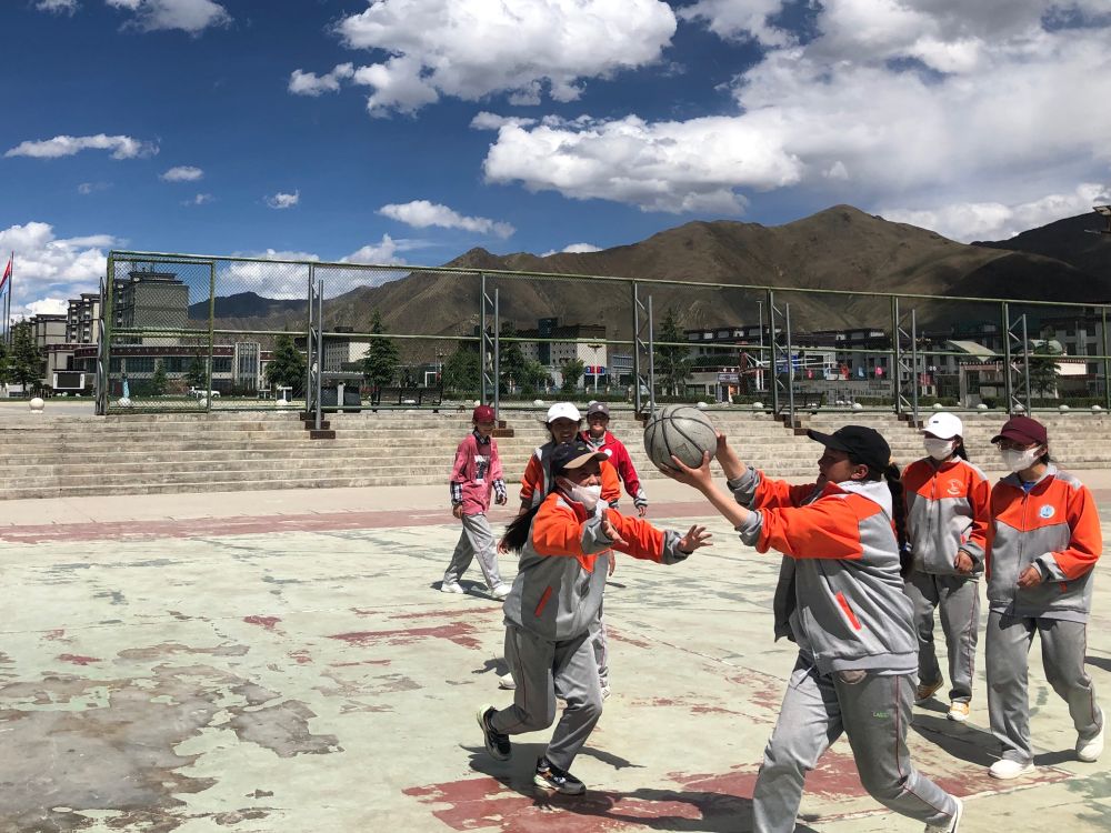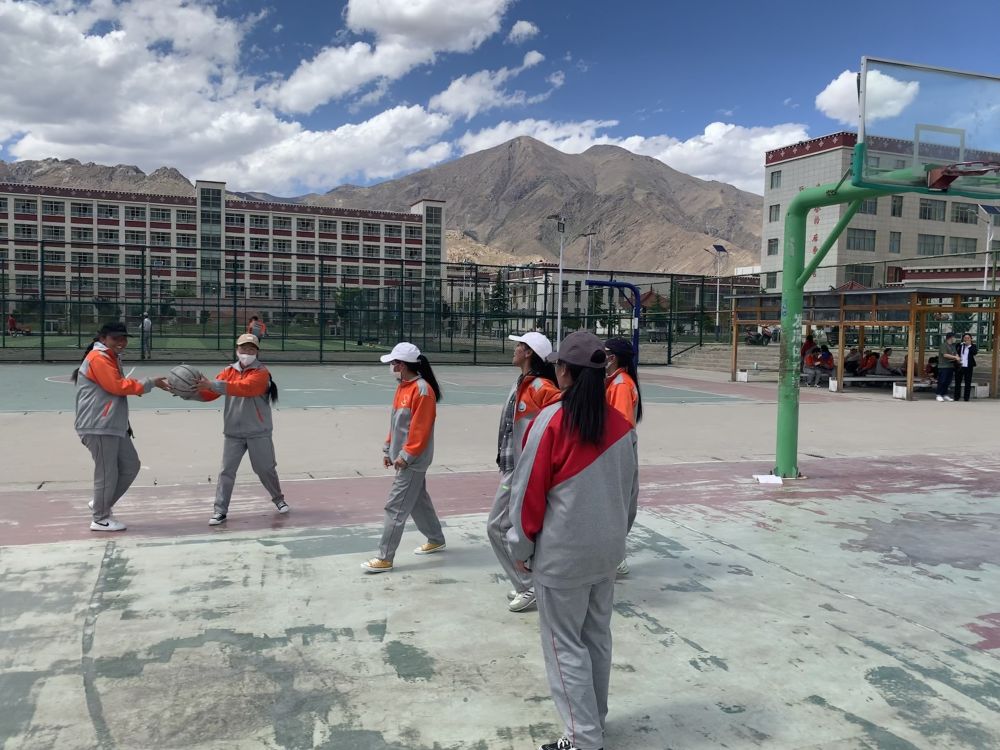 6月1日,西藏自治區(qū)拉薩市,拉薩那曲第二高級(jí)中學(xué)女學(xué)生們?cè)诓賵?chǎng)打籃球。新華社記者齊菲攝