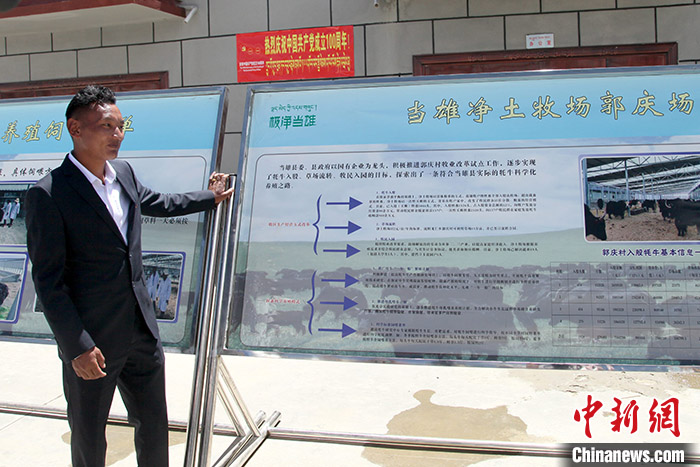 圖為6月2日,凈土牧場(chǎng)郭慶場(chǎng)負(fù)責(zé)人阿旺多布杰向記者介紹相關(guān)情況。中新社記者 陳小愿 攝