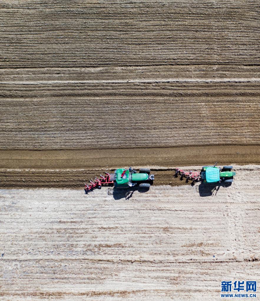 西藏拉薩市曲水縣茶巴朗村農(nóng)民利用機(jī)械設(shè)備播種“藏青2000”(無(wú)人機(jī)照片, 2020年4月22日攝)。新華社記者 普布扎西 攝