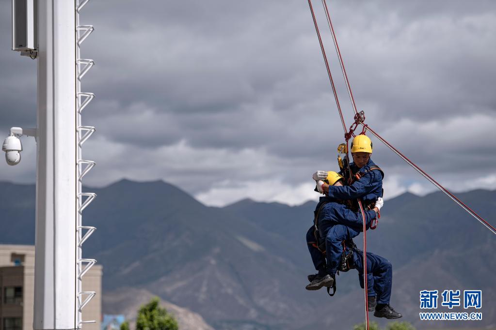 6月15日,參訓(xùn)學(xué)員進(jìn)行鐵塔救援系統(tǒng)實際操作展示。新華社記者 孫瑞博 攝