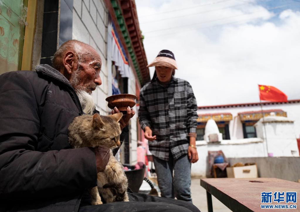 次多杰老人的孫女在給老人敬茶(4月25日攝)。新華社記者 晉美多吉 攝