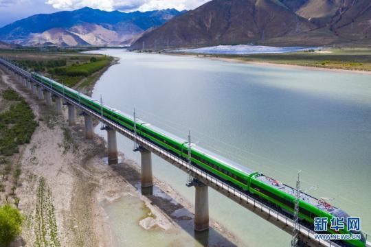 試運(yùn)行的復(fù)興號(hào)列車行駛在雅魯藏布江上(6月16日攝,無人機(jī)照片)。新華社記者 普布扎西 攝