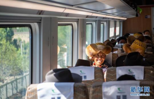 來自山南市貢嘎縣杰德秀鎮(zhèn)杰德秀村的巴珠,今年68歲,他一會(huì)兒從車窗眼望高山峽谷,一會(huì)兒摸摸車內(nèi)現(xiàn)代化設(shè)施,這是他頭一次坐火車?!皬?fù)興號(hào)和牛車比起來,像是在飛翔?!彼χf。