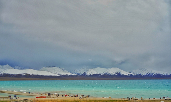 從羊八井出發(fā)至當雄縣,有一條向左的岔路,沿著這條路一直向前開約60公里,就能到達西藏最著名的景區(qū)之一——納木措。納木措,湖面海拔4718米,形狀近似長方形,東西長70多千米,南北寬30多千米,湖的東南部是直插云宵、終年積雪的念青唐古拉山主峰,清澈的湖水便來自念青唐古拉山融化的冰雪,北側(cè)則倚偎著和緩連綿的高原丘陵,廣闊的草原繞湖四周,似是將納木措小心翼翼地護在懷中。湖水顏色由罕見的碧藍與碧綠色相結(jié)合,是畫師都不易調(diào)出的顏色,遠遠望去,碧波粼粼的湖水與周圍的山脈、草原、藍天、白云交相輝映,令在場的人不禁連連感嘆仿佛置身于仙境之中。