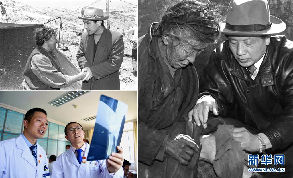 這是一張拼版照片:左上圖為來(lái)自陜西的援藏干部、阿里日土縣副縣長(zhǎng)賈冗勇深入牧區(qū),幫助藏族牧民解決生產(chǎn)、生活的實(shí)際困難(新華社記者土登攝,1997年11月11日發(fā));左下圖為2017年8月3日,北京積水潭醫(yī)院援藏醫(yī)生龔曉峰(右)和北京天壇醫(yī)院援藏醫(yī)生李家謀在拉薩市人民醫(yī)院骨科病房?jī)?nèi)查看患者的X光片,進(jìn)行工作交接(新華社記者晉美多吉攝);右圖為孔繁森(右)在阿里日土縣過(guò)巴鄉(xiāng)為孤寡老人益西卓瑪治?。ㄐ氯A社記者土登攝,1994年12月26日發(fā))。新華社發(fā)