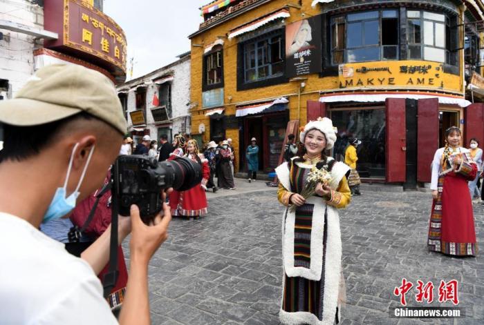 圖為7月24日,游客穿上藏族傳統(tǒng)服飾在拉薩市八廓街拍照留念。中新社記者 貢嘎來(lái)松 攝