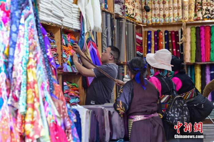 圖為7月24日,幾位藏族婦女在拉薩老城區(qū)八廓街上的藏裝店內(nèi)選購(gòu)藏裝。中新社記者 貢嘎來(lái)松 攝