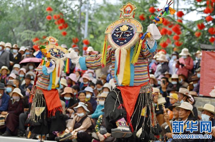 拉薩市堆龍德慶區(qū)馬鄉(xiāng)措麥村民間藏戲隊(duì)在表演藏戲(2021年6月12日攝)。新華社記者 春拉 攝
