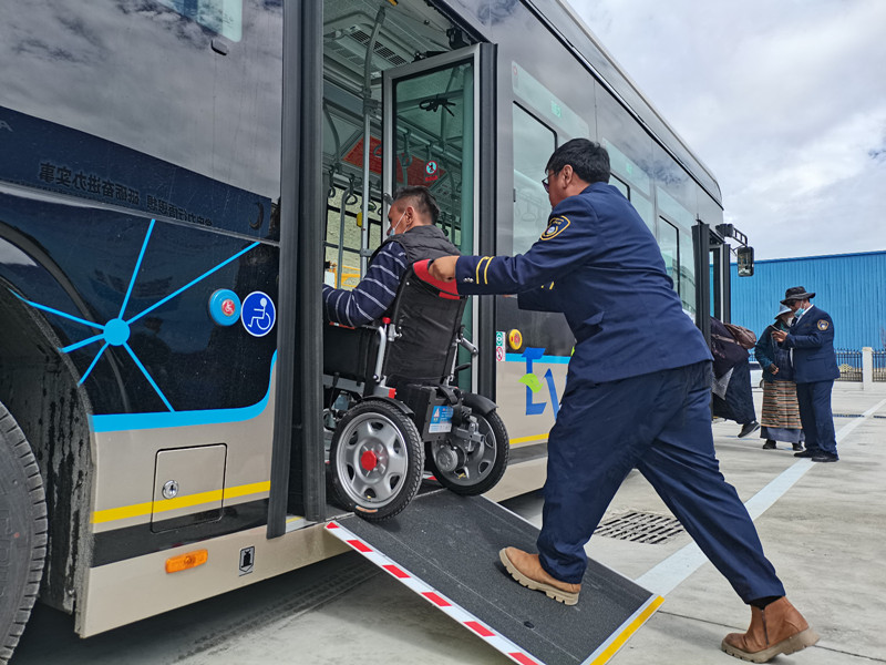 3日,拉薩市公交運(yùn)營(yíng)有限公司舉行拉薩公交經(jīng)開(kāi)區(qū)B區(qū)公交首末站啟用暨大站快線開(kāi)通儀式?,F(xiàn)場(chǎng),坐在輪椅上的市民覺(jué)列準(zhǔn)備乘坐新公交車,駕駛員接到乘車提示后,采取制動(dòng)措施,將車輛熄火后來(lái)到后門處,將無(wú)障礙踏板翻開(kāi)并固定好,順利幫其上車。
