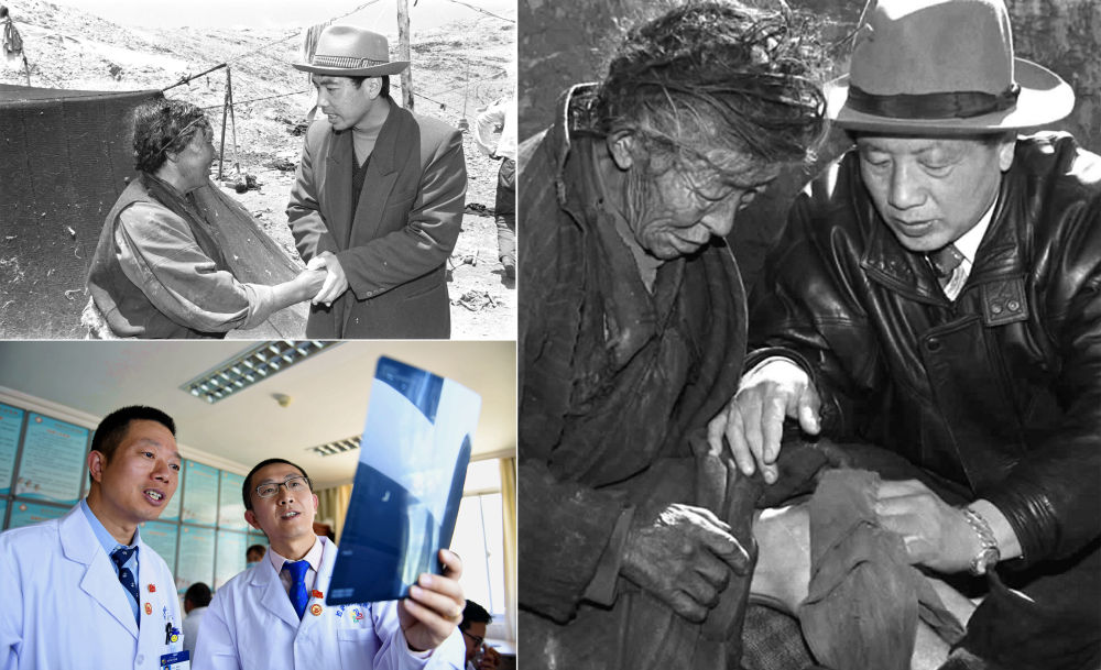 左上圖為來自陜西的援藏干部、阿里日土縣副縣長賈冗勇深入牧區(qū),幫助藏族牧民解決生產(chǎn)、生活的實(shí)際困難(新華社記者土登攝,1997年11月11日發(fā));左下圖為2017年8月3日,北京積水潭醫(yī)院援藏醫(yī)生龔曉峰(右)和北京天壇醫(yī)院援藏醫(yī)生李家謀在拉薩市人民醫(yī)院骨科病房內(nèi)查看患者的X光片,進(jìn)行工作交接(新華社記者晉美多吉攝);右圖為孔繁森(右)在阿里日土縣過巴鄉(xiāng)為孤寡老人益西卓瑪治?。ㄐ氯A社記者土登攝,1994年12月26日發(fā))。